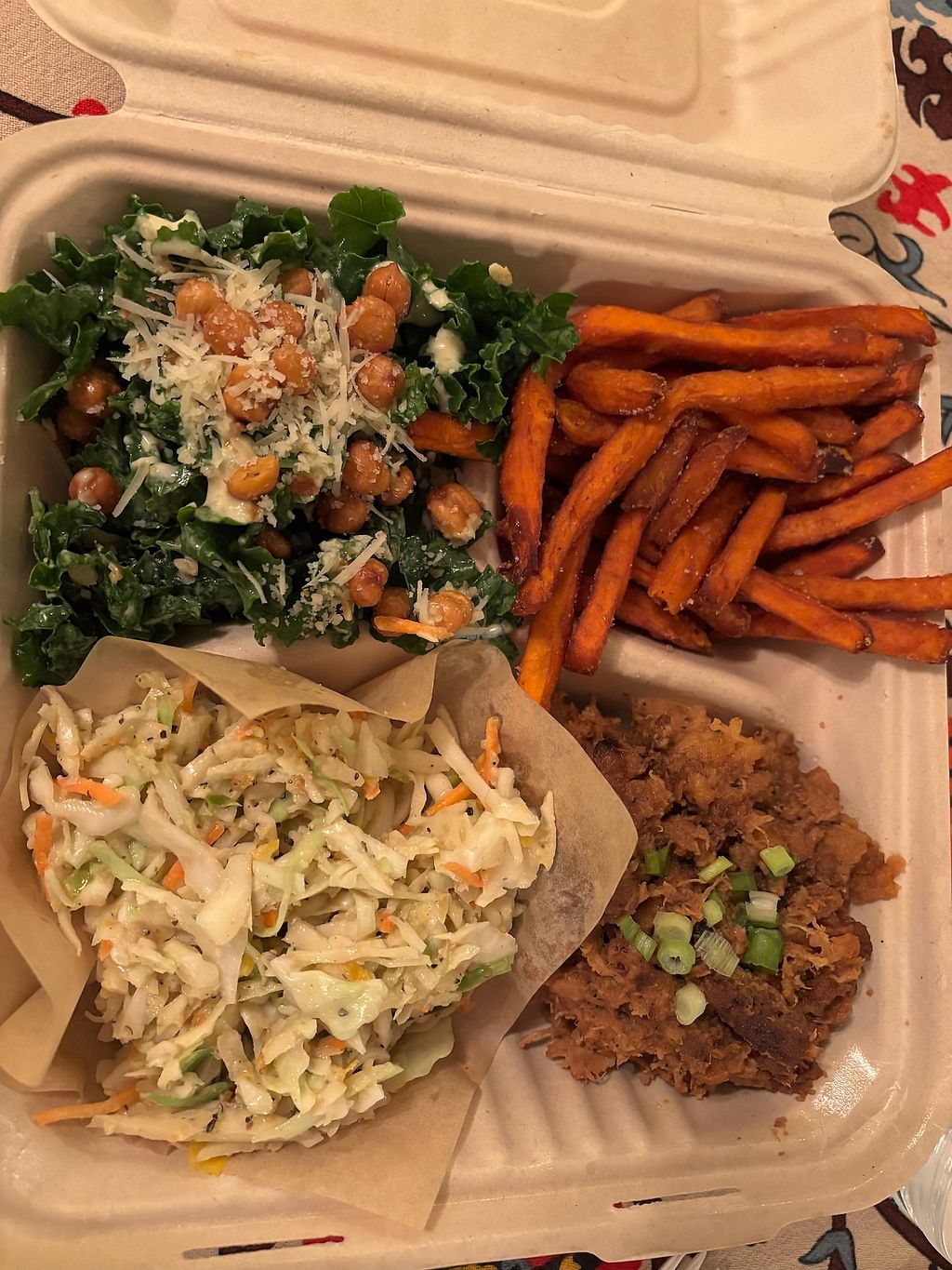 What a find! This place is absolutely incredible. I really appreciate the fact that the food is cooked to order, even if it meant we had to wait a little longer than expected, but only because the wait was 100% WORTH IT! I drug my parents here to get my vegan lunch (NC BBQ plate with slaw, collards, mac & cheese, cornbread & red velvet cake— all so delicious!) and my non-vegan parents opted to eat later after their doctors appointments at Duke. My parents just got snacks: my mom got sweet potato fries and my dad ended up getting cheesecake and said it was the best he'd ever had (even compared to non-vegan cheesecakes!). After their appointments, I was surprised BOTH my parents wanted to go back there to eat vegan soul food even when they're not vegan! My parents ended up splitting a NC BBQ plate and I got a second lunch because my first lunch was so delicious! I got the Hot Hunty Chkn Sandwich the second time around with the kale caesar salad and will be dreaming of it for months to come. I'm extremely excited to drive my parents to their follow up appointments for future meals here! My only wish was that it wasn't 2 hours away from us or else we would become regulars!